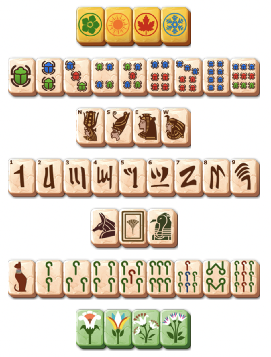Each Mahjong tileset is made up of 144 tiles. There are 136 matching tiles, 4 Flowers, and 4 season tiles. The actual tiles will vary depending on the tileset you have selected but each set maintains the same groups and relationships. The Flower and Season tiles don’t match exactly, but there is always a visual relationship among the tiles in each group. You can match any Flower tile with any other Flower tile and any Season tile with any other season tile.