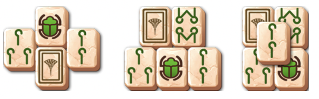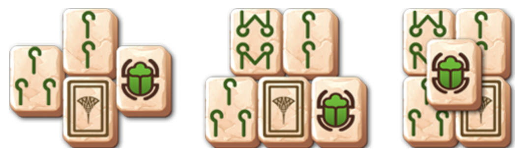 The objective of the game is to remove all of the tiles from the layout. Click on any two matching tiles to remove them. A tile is available to be clicked upon if its left or right edge is exposed and no tiles are covering any part of the tile. For example, the tile with the beetle is available in the image below.