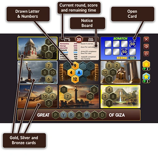 Seven Wonders is a bingo-style multiplayer game in which 8 players can play simultaneously in each room. The purpose of this game is to gather as many points as you possibly can by the activation of the cards given to you. You have at your disposal 7 cards, and each one of them has the name of the Seven Wonders of the World. The activation of the cards is achieved when all the numbers in the cells are completed. At the same time, there is a phrase of one of the Seven Wonders of the world at the bottom of the game, in which you have to complete the letters missing. The game is split in 12 timed laps of 35 seconds each. In every round you receive 6 random numbers (in the yellow cells) and 1 random letter (in the blue cell). The numbers must be placed in the corresponding empty cells which exist in your cards. The letter has to be placed in the corresponding cell of the phrase. When a player fills all the cells of a card, with the correct numbers, then the card 'flips' and in the back you can play a mini game which will grant you with some points. Along with the points of a card you have filled, you also get 3 bonus letters to place in the field with the phrase. All the points sum up and in the menu on the center you are able to see your rankings in comparison to the other users who participate in the game.
