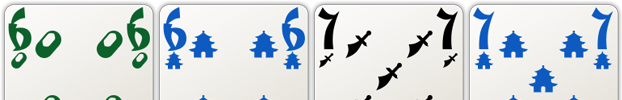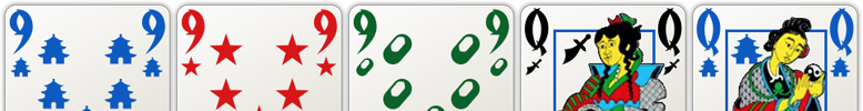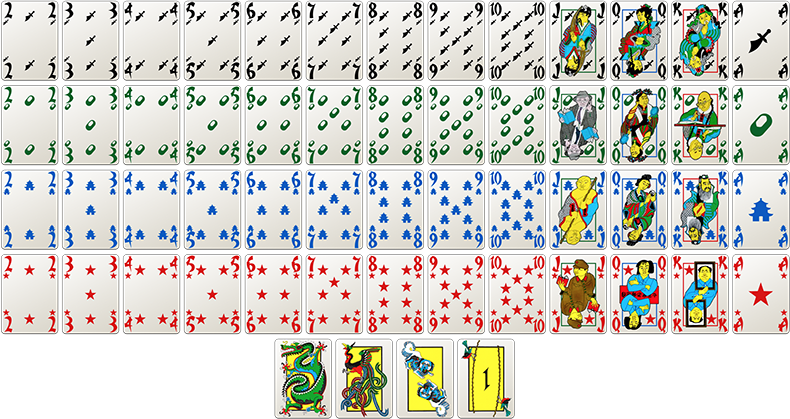 Tichu deck consists of 56 cards and four suits. The suits are Jade, Swords, Pagodas,and Stars,with each suit having 13 cards of increasing values starting from 2 to 10, J, Q, K, and A. There are also four special cards, the Dragon, the Phoenix, the Hound, and the Mah Jong.